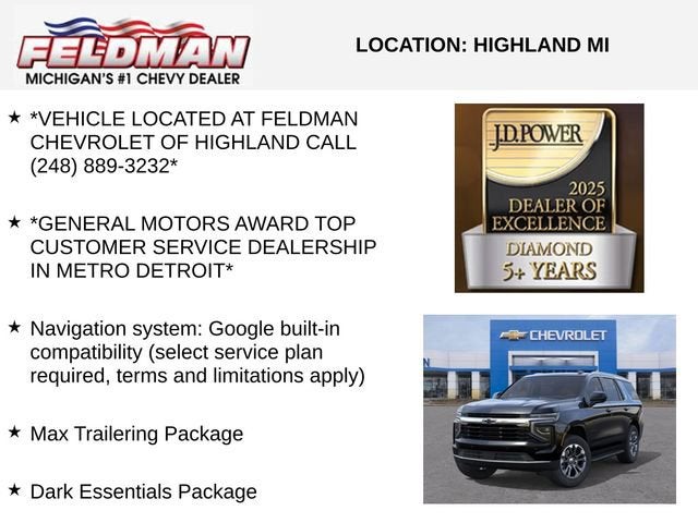 *VEHICLE LOCATED AT FELDMAN CHEVROLET OF HIGHLAND CALL (248) 889-3232*, *GENERAL MOTORS AWARD TOP CUSTOMER SERVICE DEALERSHIP IN METRO DETROIT*, 4WD, Black Cloth, 1st and 2nd Rows All-Weather Floor Liners, 2-Speed Active Electronic AutoTrac Transfer Case, 3rd Row All-Weather Floor Liners, 6-Speaker Audio System Feature, 8-Way Power Driver Seat Adjuster, Advanced Trailering Package, All-Weather Cargo Mat, All-Weather Liner Protection Package, Apple CarPlay/Android Auto, Auto High-beam Headlights, Black Name Plates, Blind Zone Steering Assist with Trailering, Dark Essentials Package, Exterior Parking Camera Rear, Extra Capacity Cooling System, Front and Rear Black Bowtie Emblems, Hill Descent Control, Hitch View with Pan/Zoom Image Adjustment, Integrated Trailer Brake Controller, Max Trailering Package, Navigation system: Google built-in compatibility (select service plan required, terms and limitations apply), Premium audio system: Chevrolet Infotainment 3, Premium Smooth Ride Suspension, Radio data system, Radio: 17.7 Diagonal Advanced Color LCD Display, Rain sensing wipers, Remote keyless entry, Remote Start, Smart Trailer Integration Indicator.